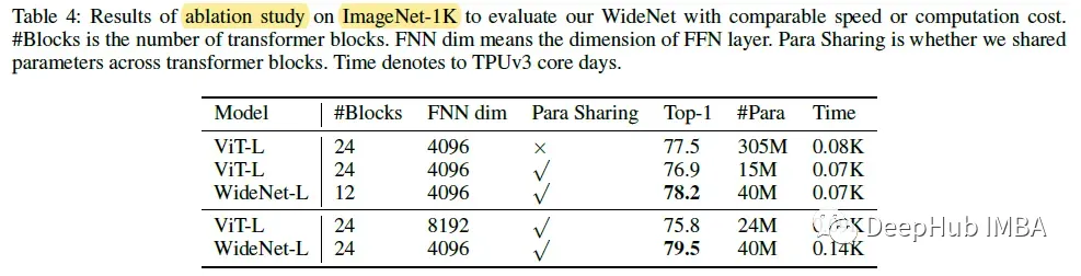 当WideNet-L比viti - l使用更少的Transformer块(即12个块)时,WideNet-L的性能比viti - l高0.7%,训练时间略少,而参数仅为13.1%,与参数共享的viti - l相比,性能则提升幅度更大。