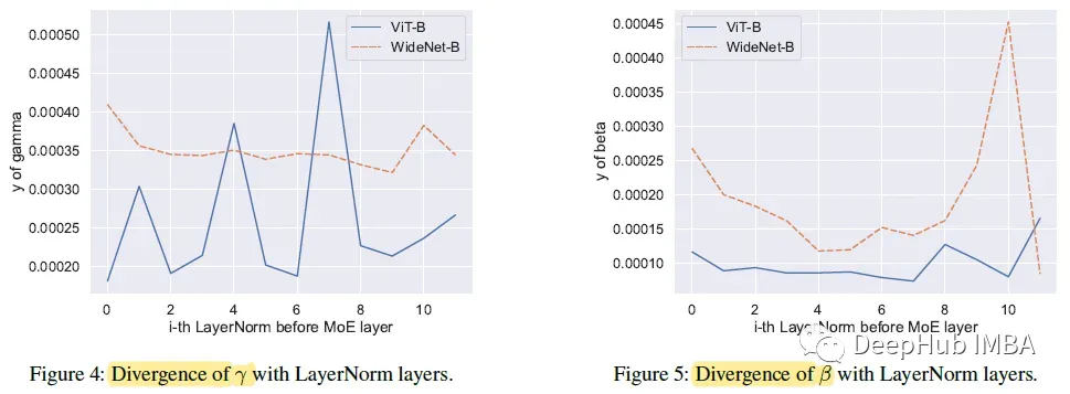 式中N为Transformer块的个数,M为向量γ或β的维数。所以WideNet中的γ和β都比ViT中的y大,这意味着MoE比ViT接受更多样化的输入。