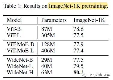 在ImageNet-1K上,WideNet-H实现了最佳性能,显著优于ViT和ViT- moe模型。