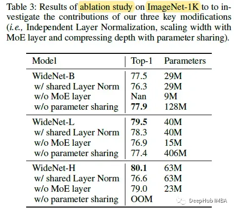 如果没有跨Transformer块的参数共享,也会有轻微的性能下降和显著的参数增量。对于没有参数共享的WideNet-H,在256个TPUv3核上训练时遇到内存不足的问题。