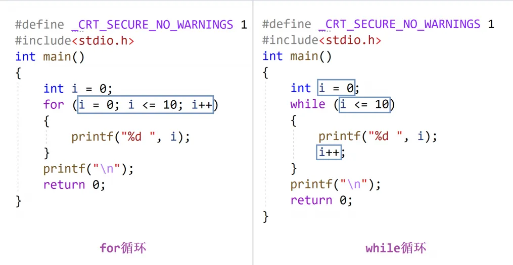 可以发现在while循环中依然存在循环的三个必须条件,但是由于风格的问题,使得三个部分很可能偏离较远,这样查找修改不够集中、方便。所以,for循环的风格更胜一筹。for循环使用的频率也最高。