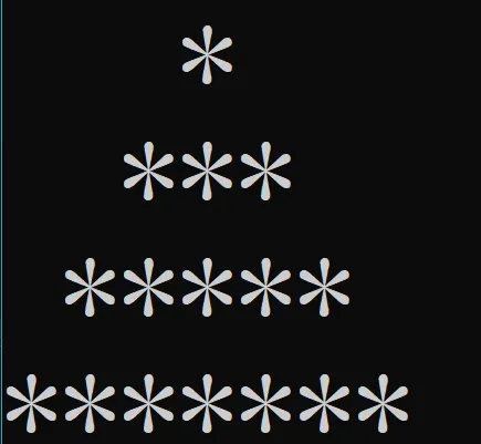 #include<stdio.h> int main() { int n = 4;//表示三角形的总行数 int i, j; for (i = 1; i <= n; i++) { //打印空格 n- i 次 for (j = 0; j < n-i; j++) { printf(" "); } //打印星星 2*i-1 次 for (j = 0;j < 2*i-1; j++) { printf("*"); } //打完一行就换行,接着下次循环即打印下一行 printf("\n"); } return 0; }