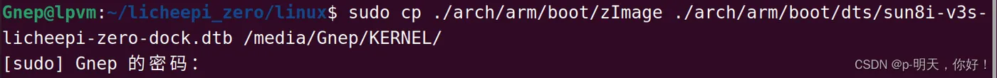 sudo cp ./arch/arm/boot/zImage ./arch/arm/boot/dts/sun8i-v3s-licheepi-zero-dock.dtb /media/Gnep/KERNEL/