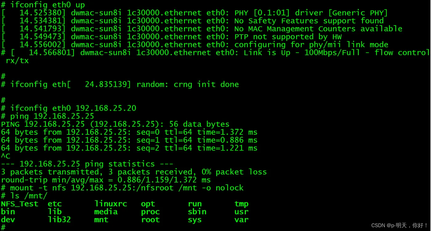 ifconfig eth0 up ifconfig eth0 192.168.25.20 ping 192.168.25.25 mount -t nfs 192.168.25.25:/nfsroot /mnt -o nolock