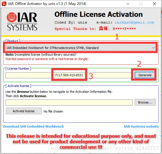 4.打开注册机:(1)选择IAR类型(STM8); (2)生产许可码; (3)复制许可码。