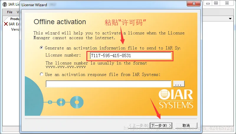 5.回到“离线激活界面”界面,粘贴注册码,点击“下一步”
