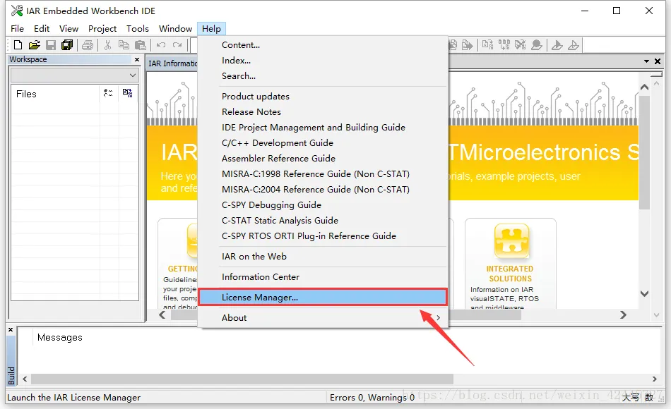 1.打开上面安装好的IAR for STM8软件(没有创建桌面快捷方式,可以从开始菜单打开软件)。 Help -> License Manager进入许可管理。