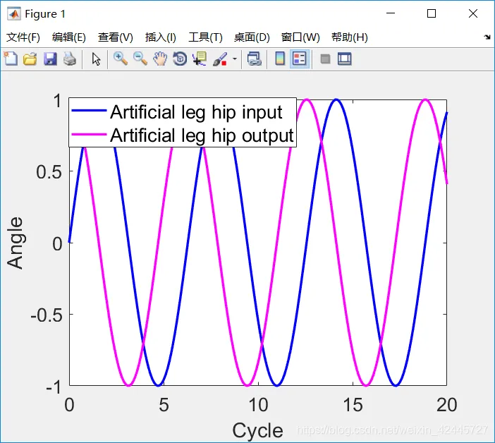1. a = [0 : 0.1: 20]; 2. b = sin(a); 3. c = cos(a); 4. 5. %设置plot函数的线宽及颜色 6. LineWidth_Plot = plot(a, b,'b', a, c, 'm'); 7. set(LineWidth_Plot,'LineWidth', 2); 8. 9. %设置横纵轴名称及字体大小 10. xlabel('Cycle','FontSize',16); 11. ylabel('Angle','FontSize',16); 12. 13. %设置plot横纵轴数字字体大小 14. set(gca,'FontSize',16); 15. 16. %设置图例名称及图例字体 17. legend_FontSize = legend('Artificial leg hip input','Artificial leg hip output'); 18. set(legend_FontSize,'FontSize',16);