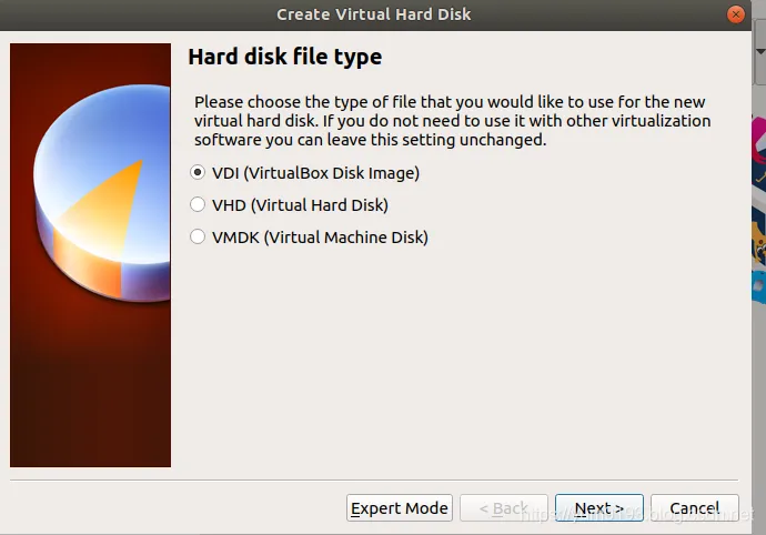 3、虚拟硬盘文件选择为VDI,下一步