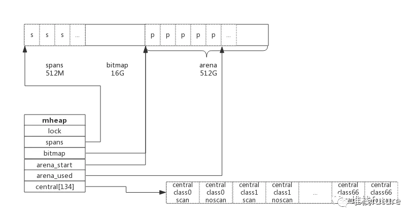 type mheap struct { lock mutex spans []*mspan //指向bitmap首地址,bitmap是从高地址向低地址增长的 bitmap uintptr //指示arena区首地址 arena_start uintptr //指示arena区已使用地址位置 arena_used uintptr central [67*2]struct { mcentral mcentral pad [sys.CacheLineSize - unsafe.Sizeof(mcentral{})%sys.CacheLineSize]byte } }
