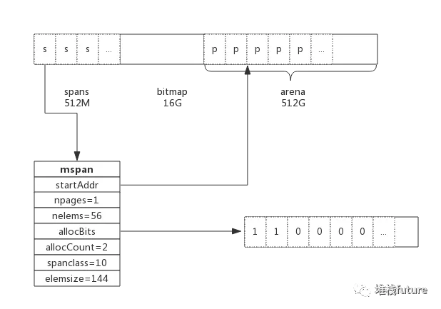 spanclass为10,参照class表可得出npages=1,nelems=56,elemsize为144。其中startAddr是在span初始化时就指定了某个页的地址。allocBits指向一个位图,每位代表一个块是否被分配,本例中有两个块已经被分配,其allocCount也为2。