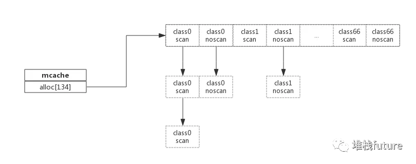 alloc为mspan的指针数组,数组大小为class总数的2倍。数组中每个元素代表了一种class类型的span列表,每种class类型都有两组span列表,第一组列表中所表示的对象中包含了指针,第二组列表中所表示的对象不含有指针,这么做是为了提高GC扫描性能,对于不包含指针的span列表,没必要去扫描。