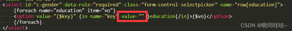 <select id="c-education" data-rule="required" class="form-control selectpicker" name="row[education]"> {foreach name="education" item="vo"} <option value="{$key}" {in name="key" value="" }selected{/in}>{$vo}</option> {/foreach} </select>