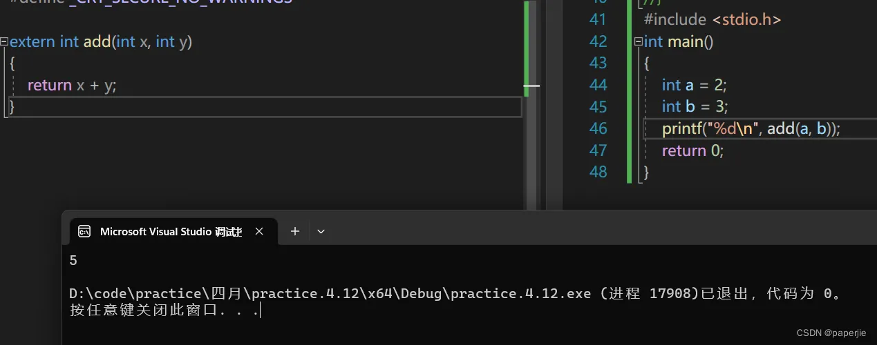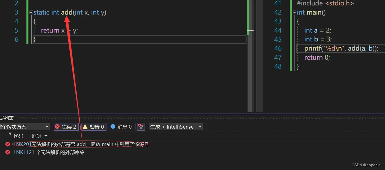 使用static:使用后直接报错,无法解析外部符号add这个函数,因为它的外部属性变成了内部属性。