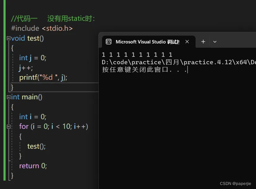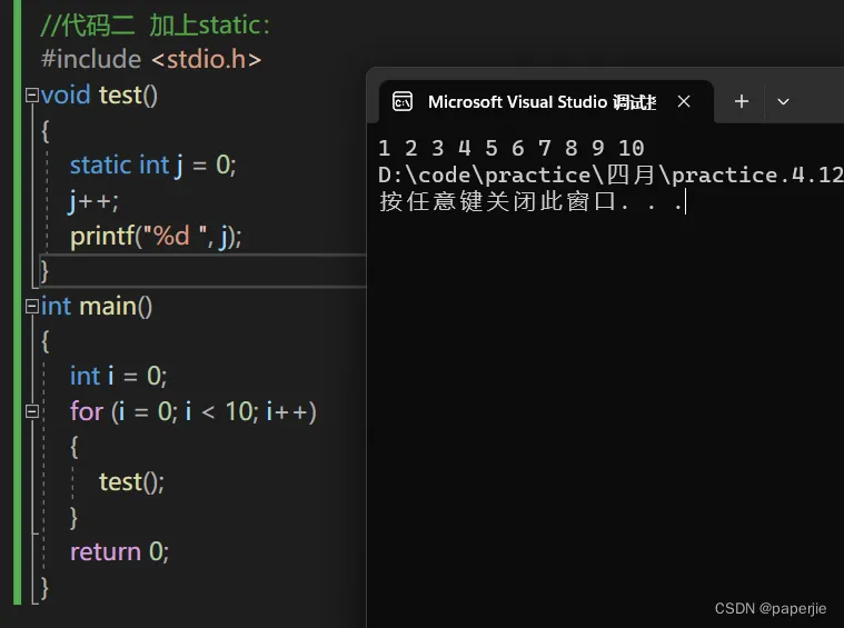 通过结果都是1,我们可以发现没有用static局部变量j一出局部范围就销毁了,下一次循环上来还是0,所以局部变量j的生命周期还在test()这个局部范围里,并没有改变。