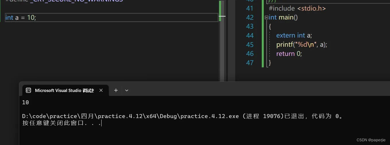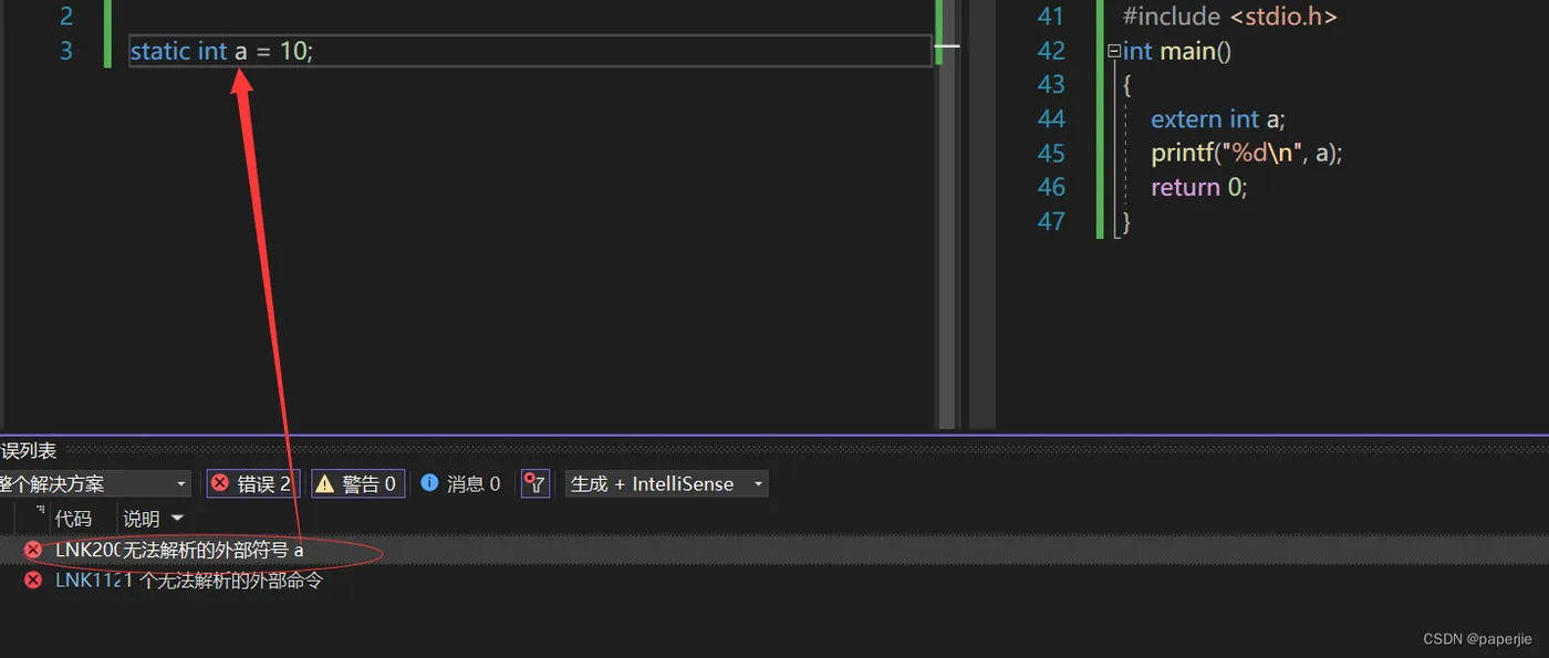 使用static修饰a:发现编辑器直接报错了,a在test.c这个源文件里无法使用。
