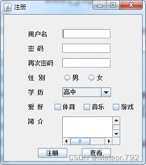 1. import java.awt.FlowLayout; 2. import java.awt.GridLayout; 3. import java.awt.event.ActionEvent; 4. import java.awt.event.ActionListener; 5. import javax.swing.ButtonGroup; 6. import javax.swing.JButton; 7. import javax.swing.JCheckBox; 8. import javax.swing.JComboBox; 9. import javax.swing.JFrame; 10. import javax.swing.JLabel; 11. import javax.swing.JMenu; 12. import javax.swing.JMenuBar; 13. import javax.swing.JMenuItem; 14. import javax.swing.JOptionPane; 15. import javax.swing.JPasswordField; 16. import javax.swing.JRadioButton; 17. import javax.swing.JScrollPane; 18. import javax.swing.JTextArea; 19. import javax.swing.JTextField; 20. 21. public class MyJFrame extends JFrame{ 22. JLabel jl1,jl2,jl3,jl4,jl5,jl6,jl7; 23. JTextField jtf;//文本框 24. JPasswordField jpf1,jpf2;//密码 25. JTextArea jta; 26. JButton jb1,jb2; 27. JRadioButton jrb1,jrb2; 28. JCheckBox jcb1,jcb2,jcb3; 29. JComboBox<String> jc; 30. public MyJFrame() { 31. this.setTitle("注册"); 32. setBounds(300,300,500,600); 33. //设置窗体为流式布局 34. //setLayout(new FlowLayout()); 35. //设置窗体为网格布局 36. setLayout(new GridLayout(20,1)); 37. //空布局 38. setLayout(null); 39. init(); 40. setVisible(true); 41. setDefaultCloseOperation(EXIT_ON_CLOSE); 42. jb1.addActionListener(new ActionListener(){ 43. 44. @Override 45. public void actionPerformed(ActionEvent arg0) { 46. String info=""; 47. info="姓名:"+jtf.getText(); 48. info+="\r\n"+"密码:"+jpf1.getText(); 49. info+="\r\n"+"密码:"+jpf2.getText(); 50. info+="\r\n"+"性别:"; 51. if (jrb1.isSelected()) 52. info+=jrb1.getText(); 53. if (jrb2.isSelected()) 54. info+=jrb2.getText(); 55. info+="\r\n爱好:"; 56. if(jcb1.isSelected()) 57. info+=jcb1.getText(); 58. if(jcb2.isSelected()) 59. info+=jcb2.getText(); 60. if(jcb3.isSelected()) 61. info+=jcb3.getText(); 62. info+="\r\n学历:"+jc.getSelectedItem(); 63. info+="\r\n简历:"+jta.getText(); 64. JOptionPane.showMessageDialog(null, info); 65. } 66. 67. }); 68. jb2.addActionListener(new ActionListener() { 69. 70. @Override 71. public void actionPerformed(ActionEvent e) { 72. // System.exit(0); 73. //获取事件源对象 74. JButton jb=(JButton)e.getSource(); 75. jtf.setText(jb.getText()); 76. } 77. }); 78. } 79. //注册用的组件初始化 80. public void init() { 81. // TODO Auto-generated method stub 82. jl1=new JLabel("用户名:"); 83. jl2=new JLabel("密码:"); 84. jl7=new JLabel("再次密码:"); 85. jl3=new JLabel("简历:"); 86. jl4=new JLabel("性别:"); 87. jtf=new JTextField(10); 88. jpf1=new JPasswordField(10); 89. jpf2=new JPasswordField(10); 90. jta=new JTextArea(4,20); 91. jb1=new JButton("注册"); 92. jb2=new JButton("取消"); 93. jl1.setBounds(100,30,180,30); 94. jtf.setBounds(200,30,180,30); 95. jl2.setBounds(100, 70, 180, 30); 96. jpf1.setBounds(200, 70, 180, 30); 97. jl7.setBounds(100, 110, 180, 30); 98. jpf2.setBounds(200, 110, 180, 30); 99. jl3.setBounds(100, 280, 100, 30); 100. jta.setBounds(100,280,400,200); 101. JScrollPane jsp=new JScrollPane(jta); 102. jsp.setHorizontalScrollBarPolicy(JScrollPane.HORIZONTAL_SCROLLBAR_ALWAYS); 103. jsp.setVerticalScrollBarPolicy(JScrollPane.VERTICAL_SCROLLBAR_ALWAYS); 104. jsp.setBounds(170, 280, 240, 100); 105. jb1.setBounds(100, 400, 100, 30); 106. jb2.setBounds(220, 400, 100, 30); 107. jrb1=new JRadioButton("男"); 108. jrb2=new JRadioButton("女"); 109. jl4.setBounds(100, 150, 180, 30); 110. jrb1.setBounds(200,150, 100, 30); 111. jrb2.setBounds(300,150, 100, 30); 112. ButtonGroup bg=new ButtonGroup(); 113. bg.add(jrb1); 114. bg.add(jrb2); 115. jl5=new JLabel("爱好:"); 116. jcb1=new JCheckBox("游戏"); 117. jcb2=new JCheckBox("篮球"); 118. jcb3=new JCheckBox("旅游"); 119. jl5.setBounds(100 , 240, 100, 30); 120. jcb1.setBounds(160 , 240, 100, 30); 121. jcb2.setBounds(260 , 240, 100, 30); 122. jcb3.setBounds(360 , 240, 100, 30); 123. jl6=new JLabel("学历:"); 124. jc=new JComboBox<>(); 125. jc.addItem("高中"); 126. jc.addItem("大专"); 127. jc.addItem("本科"); 128. jc.addItem("研究生"); 129. jl6.setBounds(100 , 200, 100, 30); 130. jc.setBounds(200 , 200, 100, 30); 131. add(jl1); 132. add(jtf); 133. add(jl2); 134. add(jpf1); 135. add(jl7); 136. add(jpf2); 137. add(jl3); 138. add(jsp); 139. add(jl4); 140. add(jrb1); 141. add(jrb2); 142. add(jl5); 143. add(jcb1); 144. add(jcb2); 145. add(jcb3); 146. add(jl6); 147. add(jc); 148. add(jb1); 149. add(jb2); 150. } 151. public static void main(String[] args) { 152. new MyJFrame(); 153. } 154. }