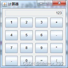 1. import java.awt.BorderLayout; 2. import java.awt.Font; 3. import java.awt.GridLayout; 4. import java.awt.event.ActionEvent; 5. import java.awt.event.ActionListener; 6. 7. import javax.swing.JButton; 8. import javax.swing.JFrame; 9. import javax.swing.JOptionPane; 10. import javax.swing.JPanel; 11. import javax.swing.JTextField; 12. 13. public class CalcJFrame extends JFrame{ 14. JButton[] jbs; 15. JButton jb2; 16. JTextField jtf; 17. String[] cons={"1","2","3","+","4","5","6","-","7","8","9","*","0",".","/","="}; 18. JPanel jp1; 19. String op1="",ops=""; 20. double num1,num2; 21. //flag=0,表示连续输入操作数,flag=1表示新的操作数开始 22. int flag=0; 23. public CalcJFrame() { 24. setTitle("计算器"); 25. setBounds(400,300,400,500); 26. setDefaultCloseOperation(EXIT_ON_CLOSE); 27. init(); 28. setVisible(true); 29. for(int i=0;i<16;i++){ 30. jbs[i].addActionListener(new ActionListener() { 31. 32. @Override 33. public void actionPerformed(ActionEvent e) { 34. JButton jb=(JButton)e.getSource(); 35. //获取用户单击的按钮上面的文本 36. char ch=jb.getText().charAt(0); 37. //判断单击的按钮属于哪个类型 38. if (ch>='0' && ch<='9'|| ch=='.'){ 39. //如果是数字 40. if (flag==1) { 41. //如果之前进行了计算,文本框中是计算结果,准备接收下一个操作数,op1清空, 42. op1=""; 43. //准备接收下一个操作数的连续输入 44. flag=0; 45. } 46. //数字连接,并显示在文本框 47. op1=op1+ch; 48. jtf.setText(op1); 49. }else if (ch=='='){//表示要对两个操作数进行运算 50. //记录刚才单击的是等号 51. flag=1; 52. //获取第二个操作数 53. num2=Double.parseDouble(op1); 54. //根据运算符进行计算 55. switch(ops){ 56. case "+": num1=num1+num2;break; 57. case "-": num1=num1-num2;break; 58. case "*": num1=num1*num2;break; 59. case "/": if (num2!=0) {num1=num1/num2;} 60. else JOptionPane.showMessageDialog(null, "出错!除数不能为零"); 61. num1=0.0;break; 62. } 63. //运算符清空 64. ops=""; 65. //将结果放在op1中 66. op1=num1+""; 67. //结果显示在文本框 68. jtf.setText(op1); 69. 70. }else{//单击了运算符,表示第二个操作数录入结束 71. if (ops!=""){//如果连续运算 72. //记录要进行计算, 73. flag=1; 74. 75. //将文本框中的内容保存在num2中 76. num2=Double.parseDouble(jtf.getText()); 77. //根据运算符计算结果 78. switch(ops){ 79. case "+": num1=num1+num2;break; 80. case "-": num1=num1-num2;break; 81. case "*": num1=num1*num2;break; 82. // case "/": if (num2!=0) num1=num1/num2;break; 83. } 84. //获取运算符到ops中 85. ops=ch+""; 86. //将计算结果放在op1中 87. op1=num1+""; 88. //将结果显示在文本框 89. jtf.setText(op1); 90. }else{//独立的单个运算,只需要记录运算符和第一个操作数 91. ops=ch+""; 92. num1=Double.parseDouble(op1); 93. //保存完第一个操作数后,清空op1内容,准备存储第二个操作数。 94. op1=""; 95. } 96. } 97. } 98. }); 99. jb2.addActionListener(new ActionListener() { 100. 101. @Override 102. public void actionPerformed(ActionEvent e) { 103. num1=0; 104. op1=""; 105. jtf.setText(""); 106. jtf.requestFocus(); 107. } 108. }); 109. } 110. } 111. public void init() { 112. jtf=new JTextField(); 113. jtf.setFont(new Font("宋体", 0, 30)); 114. jtf.setHorizontalAlignment(jtf.RIGHT); 115. jtf.setText(""); 116. add(jtf,BorderLayout.NORTH); 117. jp1=new JPanel(); 118. GridLayout gridLayout = new GridLayout(4,4); 119. gridLayout.setHgap(8); 120. gridLayout.setVgap(8); 121. jp1.setLayout(gridLayout); 122. jbs=new JButton[16]; 123. for(int i=0;i<16;i++){ 124. jbs[i]=new JButton(); 125. jbs[i].setText(cons[i]); 126. jbs[i].setFont(new Font("宋体",0,30)); 127. jp1.add(jbs[i]); 128. } 129. add(jp1); 130. jb2=new JButton("清空"); 131. jb2.setFont(new Font("宋体", 0, 30)); 132. add(jb2,BorderLayout.SOUTH); 133. } 134. public static void main(String[] args) { 135. new CalcJFrame(); 136. } 137. }
