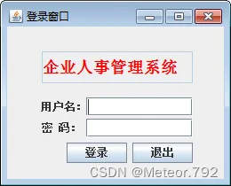 1. import java.awt.Color; 2. import java.awt.Font; 3. import java.awt.GridLayout; 4. import java.awt.event.ActionEvent; 5. import java.awt.event.ActionListener; 6. 7. import javax.swing.JButton; 8. import javax.swing.JFrame; 9. import javax.swing.JLabel; 10. import javax.swing.JOptionPane; 11. import javax.swing.JPasswordField; 12. import javax.swing.JTextField; 13. 14. public class Login extends JFrame{ 15. JLabel jl1,jl2,jl3,jl4; 16. JTextField jtf;//文本框 17. JPasswordField jpf;//密码 18. JButton jb1,jb2; 19. public Login() { 20. this.setTitle("登录窗口"); 21. setBounds(300,300,500,400); 22. //设置窗体为流式布局 23. setLayout(new GridLayout(20,1)); 24. //空布局 25. setLayout(null); 26. init(); 27. setVisible(true); 28. setDefaultCloseOperation(EXIT_ON_CLOSE); 29. jb1.addActionListener(new ActionListener(){ 30. public void actionPerformed(ActionEvent e) { 31. if(jtf.getText().trim().equals("admin")&& 32. new String(jpf.getPassword()).trim().equals("123456")) 33. {JOptionPane.showMessageDialog(null, "欢迎进入本系统!"); 34. new MyFrameArea();} 35. else if(jtf.getText().trim().length()==0|| 36. new String(jpf.getPassword()).trim().length()==0) 37. {JOptionPane.showMessageDialog(null, "用户名或密码不能为空!");} 38. else {JOptionPane.showMessageDialog(null, "用户名或密码错误!");} 39. } 40. }); 41. jb2.addActionListener(new ActionListener() { 42. public void actionPerformed(ActionEvent e) { 43. // System.exit(0); 44. //获取事件源对象 45. JButton jb=(JButton)e.getSource(); 46. jtf.setText(jb.getText()); 47. } 48. }); 49. 50. } 51. public void init() { 52. jl1=new JLabel("企业人事管理系统"); 53. jl2=new JLabel("用户名:"); 54. jl3=new JLabel("密码:"); 55. jtf=new JTextField(10); 56. jpf=new JPasswordField(10); 57. jb1=new JButton("登录"); 58. jb2=new JButton("取消"); 59. jl1.setBounds(150,30,200,60); 60. jl2.setBounds(100, 120, 180, 30); 61. jtf.setBounds(200, 120, 180, 30); 62. jl3.setBounds(100, 180, 180, 30); 63. jpf.setBounds(200, 180, 180, 30); 64. jb1.setBounds(100, 260, 100, 30); 65. jb2.setBounds(220, 260, 100, 30); 66. Font font = new Font("楷体",Font.PLAIN,25); 67. jl1.setFont(font); 68. jl1.setForeground(Color.red); 69. add(jl1); 70. add(jl2); 71. add(jtf); 72. add(jl3); 73. add(jpf); 74. add(jb1); 75. add(jb2); 76. } 77. public static void main(String[] args) { 78. new Login(); 79. } 80. }