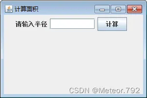 1. import java.awt.Color; 2. import java.awt.Font; 3. import java.awt.GridLayout; 4. import java.awt.event.ActionEvent; 5. import java.awt.event.ActionListener; 6. 7. import javax.swing.JButton; 8. import javax.swing.JFrame; 9. import javax.swing.JLabel; 10. import javax.swing.JOptionPane; 11. import javax.swing.JTextField; 12. 13. public class MyFrameArea extends JFrame{ 14. JLabel jl1,jl2; 15. JTextField jtf;//文本框 16. JButton jb; 17. double PI=3.14; 18. double r,S; 19. public MyFrameArea() { 20. this.setTitle("计算面积"); 21. setBounds(300,300,500,400); 22. //设置窗体为流式布局 23. setLayout(new GridLayout(20,1)); 24. //空布局 25. setLayout(null); 26. init(); 27. setVisible(true); 28. setDefaultCloseOperation(EXIT_ON_CLOSE); 29. jb.addActionListener(new ActionListener(){ 30. public void actionPerformed(ActionEvent e) { 31. String info=""; 32. info=jtf.getText(); 33. r=Double.parseDouble(info); 34. S=PI*r*r; 35. JOptionPane.showMessageDialog(null, S); 36. }});} 37. public void init() { 38. jl1=new JLabel("请输入半径:"); 39. jtf=new JTextField(); 40. jb=new JButton("计算"); 41. jl1.setBounds(20,34,200,60); 42. jtf.setBounds(180, 50, 150, 30); 43. jb.setBounds(350, 49, 100, 30); 44. Font font = new Font("楷体",Font.PLAIN,25); 45. jl1.setFont(font); 46. jl1.setForeground(Color.black); 47. add(jl1); 48. add(jtf); 49. add(jb); 50. } 51. public static void main(String[] args) { 52. new MyFrameArea(); 53. } 54. }