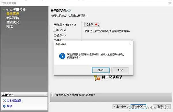 4、登录管理,点击“下一步”,提示“该选项需要您记录新的登录序列,或装入之前记录的序列,仍要继续吗?”,点击“是”;