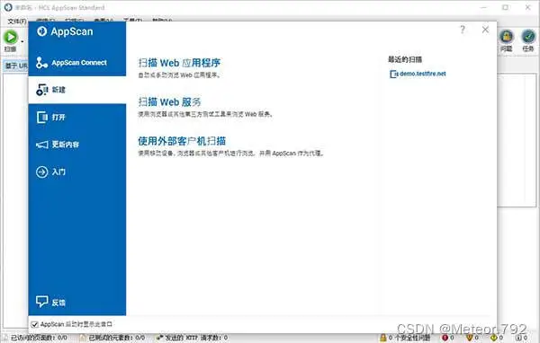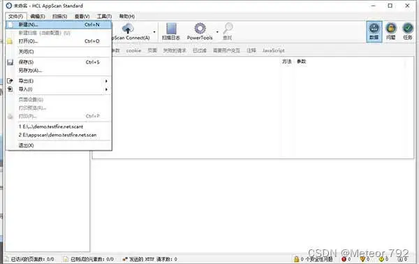 1、打开AppScan后,点击左上角文件->新建或者Ctrl+N创建扫描;