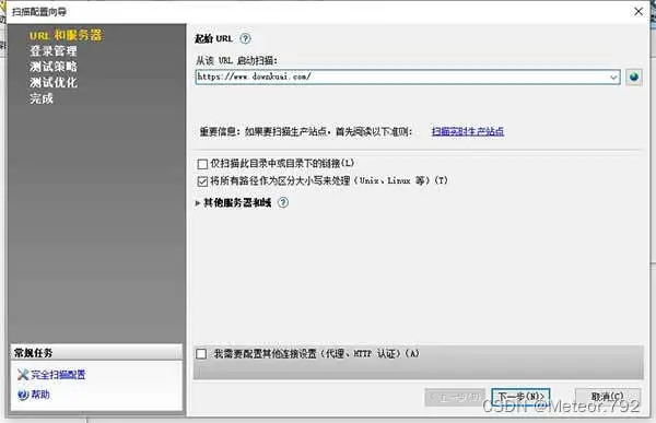3、在扫描配置向导中,URL和服务器中,输入起始URL,然后点击“下一步”;