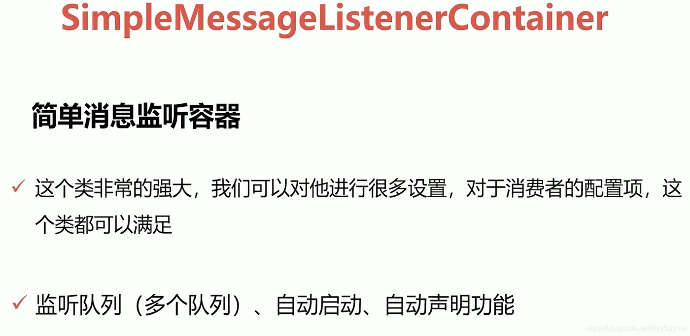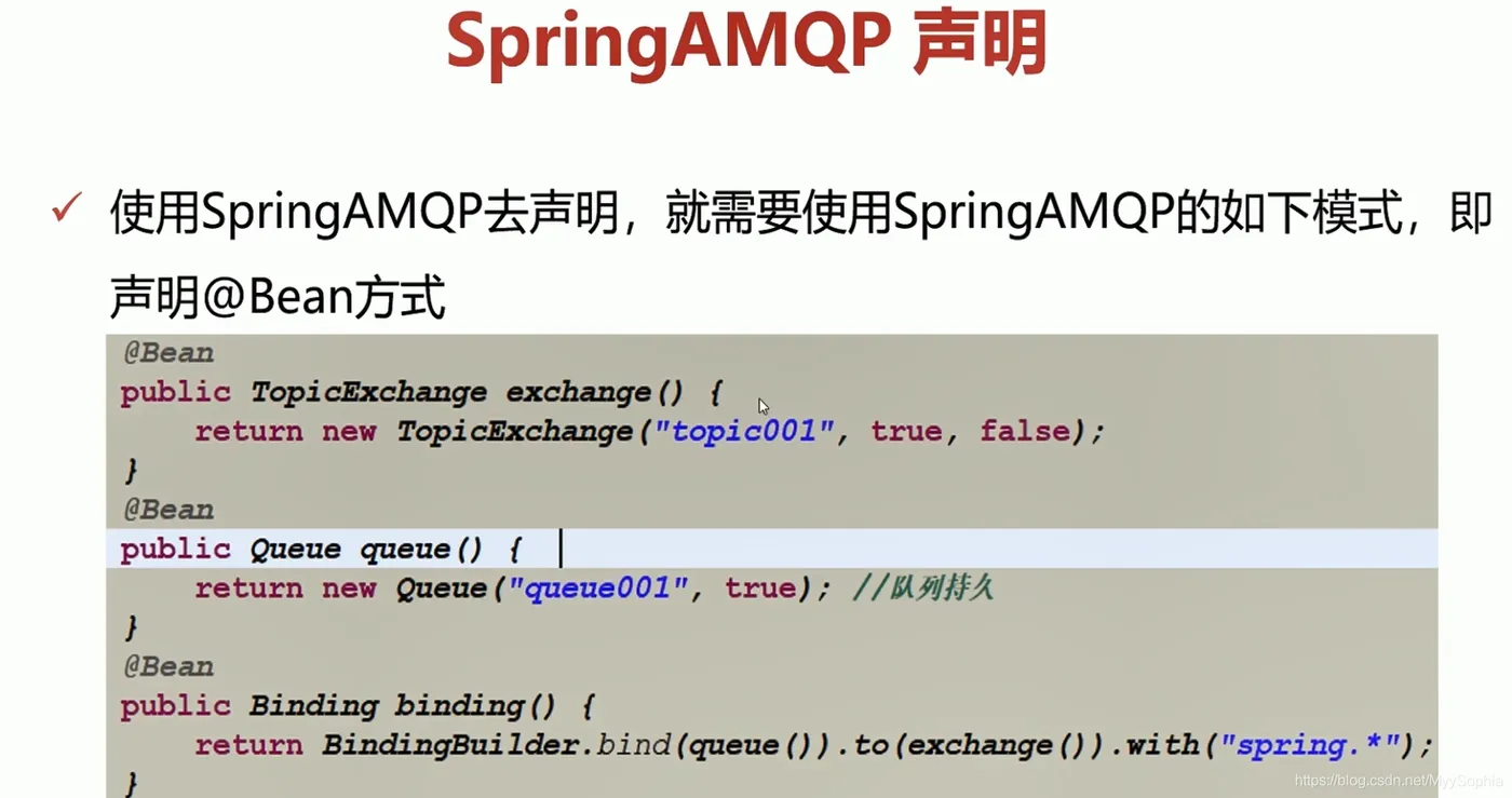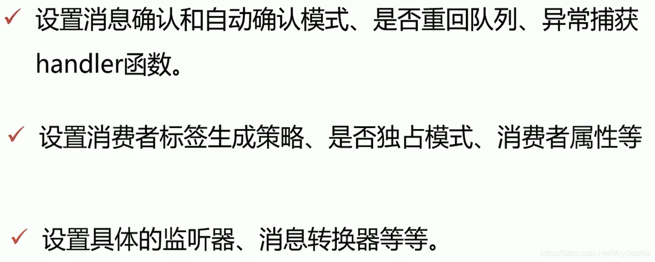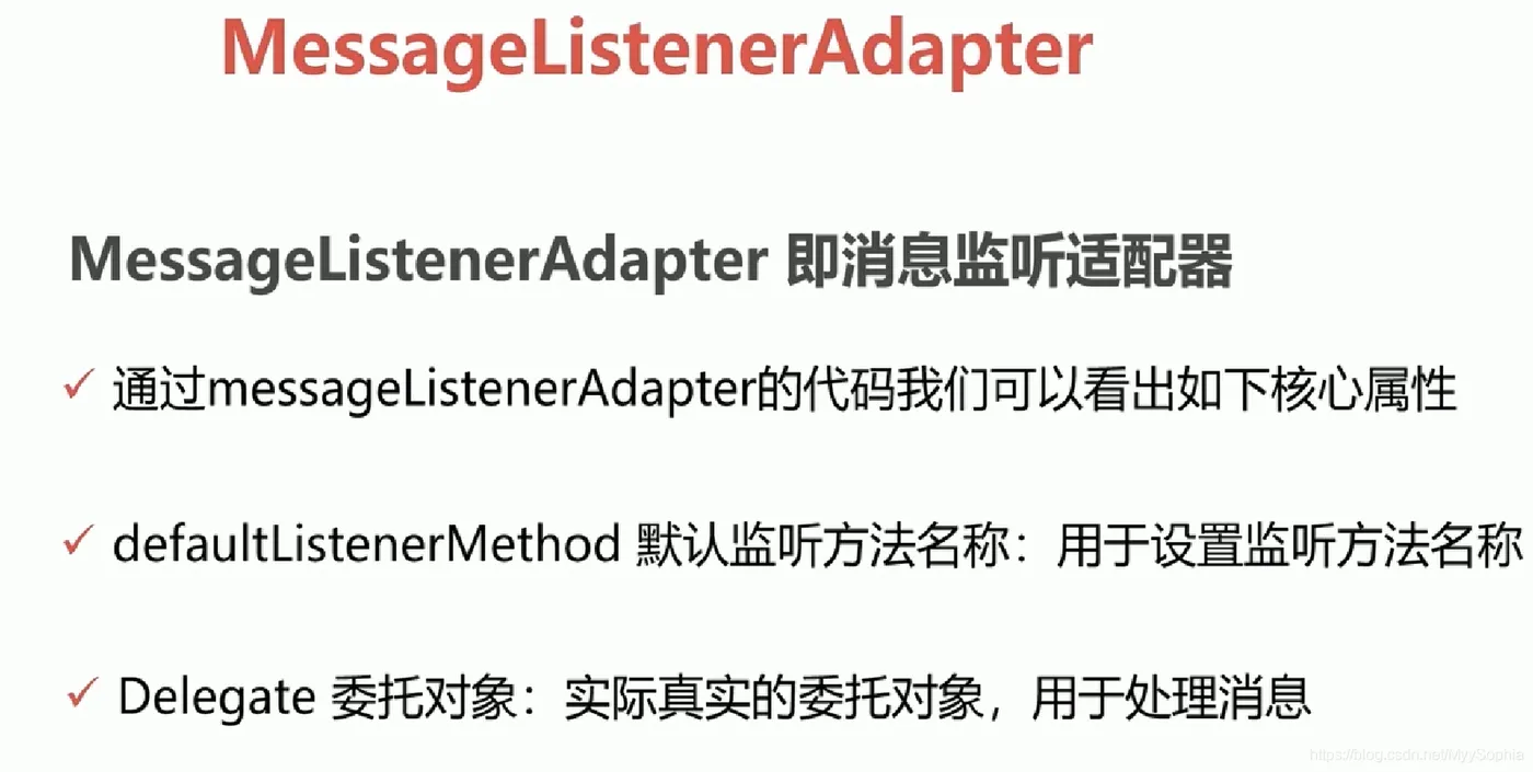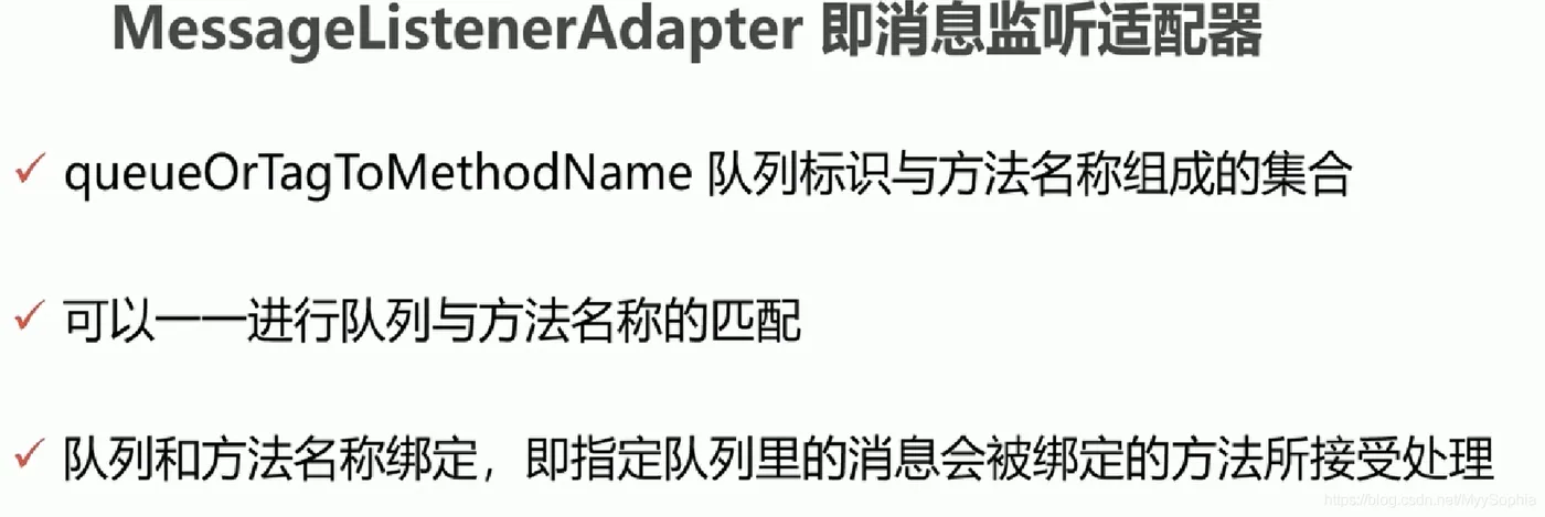 /** * 1 适配器方式. 默认是有自己的方法名字的:handleMessage // 可以自己指定一个方法的名字: consumeMessage // 也可以添加一个转换器: 从字节数组转换为String MessageListenerAdapter adapter = new MessageListenerAdapter(new MessageDelegate()); adapter.setDefaultListenerMethod("consumeMessage"); adapter.setMessageConverter(new TextMessageConverter()); container.setMessageListener(adapter); */ /** * 2 适配器方式: 我们的队列名称 和 方法名称 也可以进行一一的匹配 * MessageListenerAdapter adapter = new MessageListenerAdapter(new MessageDelegate()); adapter.setMessageConverter(new TextMessageConverter()); Map<String, String> queueOrTagToMethodName = new HashMap<>(); queueOrTagToMethodName.put("queue001", "method1"); queueOrTagToMethodName.put("queue002", "method2"); adapter.setQueueOrTagToMethodName(queueOrTagToMethodName); container.setMessageListener(adapter); */