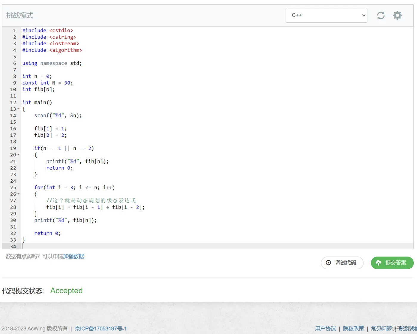 #include #include #include #include using namespace std; int n = 0; const int N = 30; int fib[N]; int main() { scanf("%d", &n); fib[1] = 1; fib[2] = 2; if(n == 1 || n == 2) { printf("%d", fib[n]); return 0; } for(int i = 3; i <= n; i++) { //这个就是动态规划的状态表达式 fib[i] = fib[i - 1] + fib[i - 2]; } printf("%d", fib[n]); return 0; }