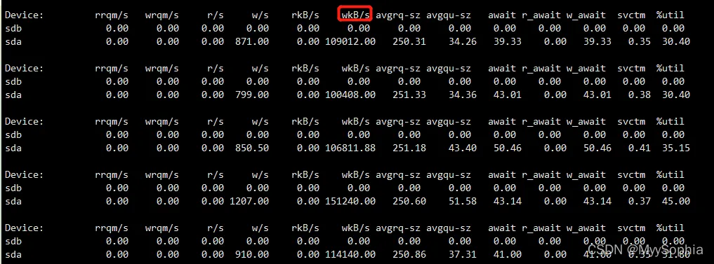 但是有iowait大约7%。虽然7% 并不能成为性能瓶颈,不过有点嫌疑——可能跟 iowait 的升高有关。