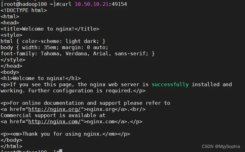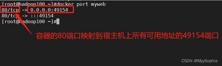 因为重启了myweb服务,所以端口变成了49154. 宿主机可以通过49154访问到nginx服务。