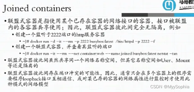 容器和另外一个容器共享Network namespace。 kubernetes中的pod就是多个容器共享一个Network namespace。(联盟式容器) |
