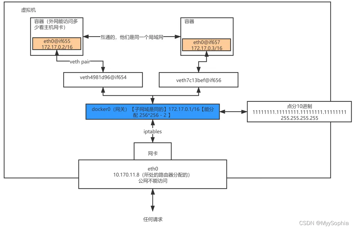 Docker使用Linux桥接,在宿主机虚拟一个Docker容器网桥(docker0),Docker启动一个容器时会根据Docker网桥的网段分配给容器一个IP地址,称为Container-IP,同时Docker网桥是每个容器的默认网关。因为在同一宿主机内的容器都接入同一个网桥,这样容器之间就能够通过容器Container-IP直接通信。
