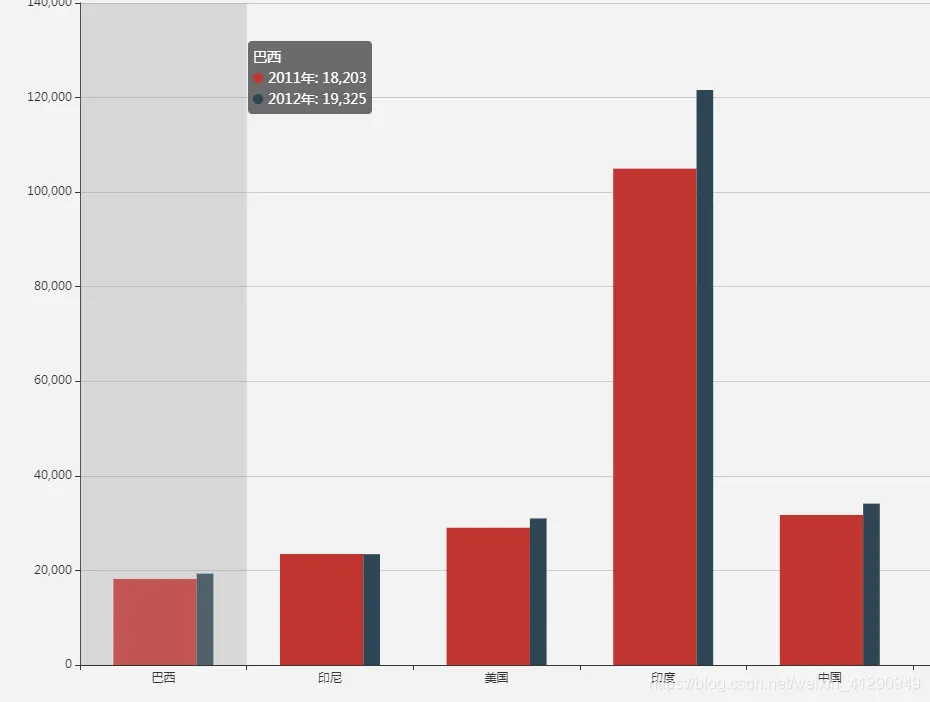 series: [ { name: '2011年', type: 'bar', barWidth:'50%', data: [18203, 23489, 29034, 104970, 31744, 30230] }, { name: '2012年', type: 'bar', barGap:"0%",//不同系列的柱间距离,为百分比,此属性应设置于此坐标系中最后一个 'bar' 系列上才会生效 barWidth:'10%', data: [19325, 23438, 31000, 121594, 34141, 81807] } ]