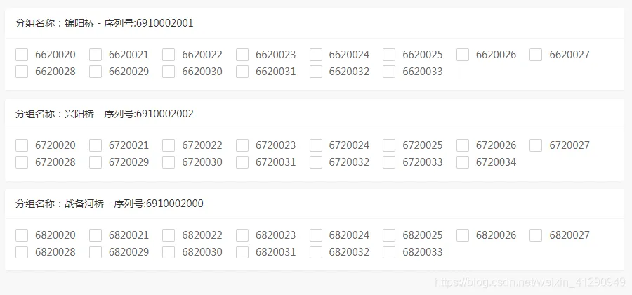 {section name=v loop=$data} <div class="layui-fluid" style="margin-top: 10px"> <div class="layui-row layui-col-space15"> <div class="layui-col-md6"> <div class="layui-card"> <div class="layui-card-header">分组名称:{$data[v].category_name} - 序列号:{$data[v].jk_sn}</div> <div class="layui-card-body layui-row layui-col-space10"> <div class="layui-col-md12"> {section name=p loop=$data[v].sensor} <input type="checkbox" name="" title="{$data[v].sensor[p].jk_serialnum}" lay-skin="primary"> {/section} </div> </div> </div> </div> </div> </div> {/section}