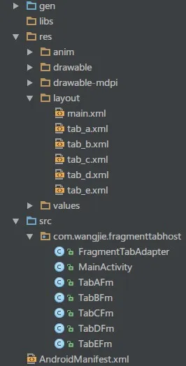 TabAFm到TabEFm都是Fragment,并且每个Fragment对应一个布局文件。