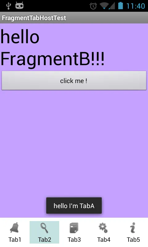 要做的是,切换到TabA,输入“I'm TabA”,切换到B,点击Button后,Toast显示“hello I'm TabA”