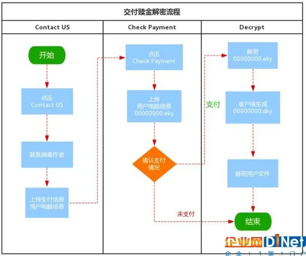 如果确认已经付款就会把00000000.eky文件进行解密并返回,病毒接收到服务器的返回会在受害计算机上生成用于解密文件的key文件00000000.dky,该文件会在Decrypt流程中使用到。