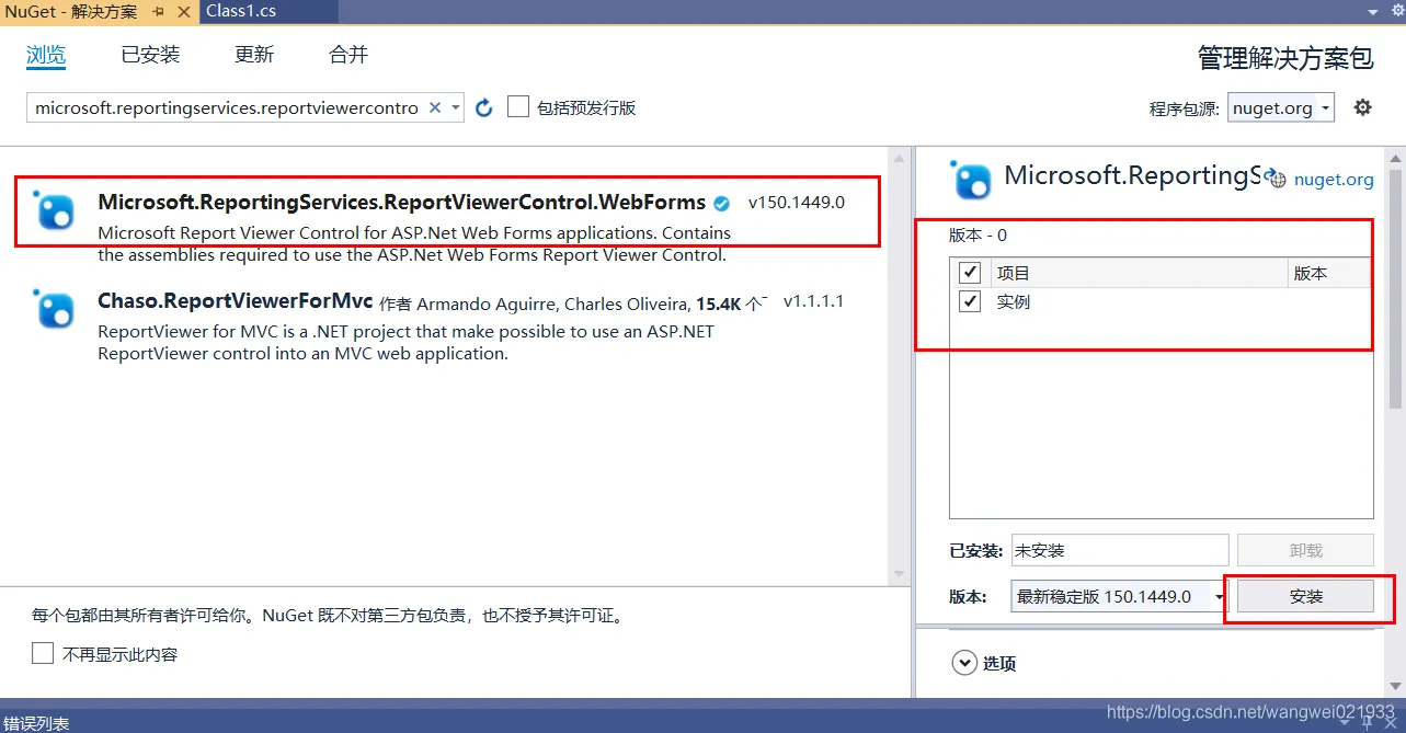 第二步:输入microsoft.reportingservices.reportviewercontrol.webforms 并且选择项目下载安装