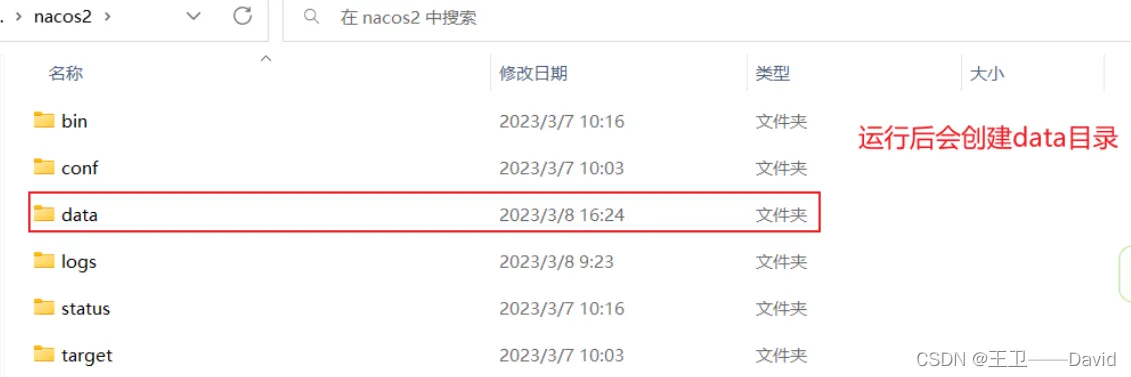 nacos的data目录是用来存储nacos服务的数据的,包括配置信息,服务信息等。默认的情况下,data目录位于naocs安装目录下的
