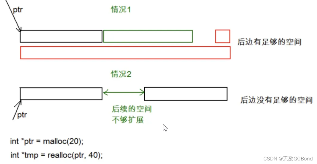 这里主要讲一下情况2,因为realloc是增加内存空间,比如我们的malloc开辟十个整型,但是现在我们需要20个,那我们就可以写成(int*)realloc(p,80),但是开辟的时候会出现问题,如果后面的空间不够,他就无法开辟,那我们要找新位置开辟,继续在堆区寻找一个位置开辟,此时我们返回的地址就不是原来的,是一个新地址。