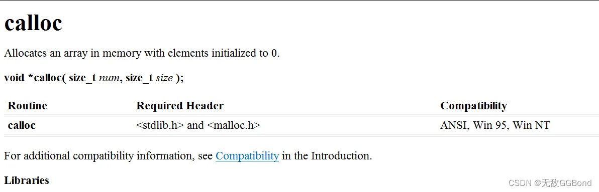 - 与函数 malloc 的区别只在于 calloc 会在返回地址之前把申请的空间的每个字节初始化为全0。