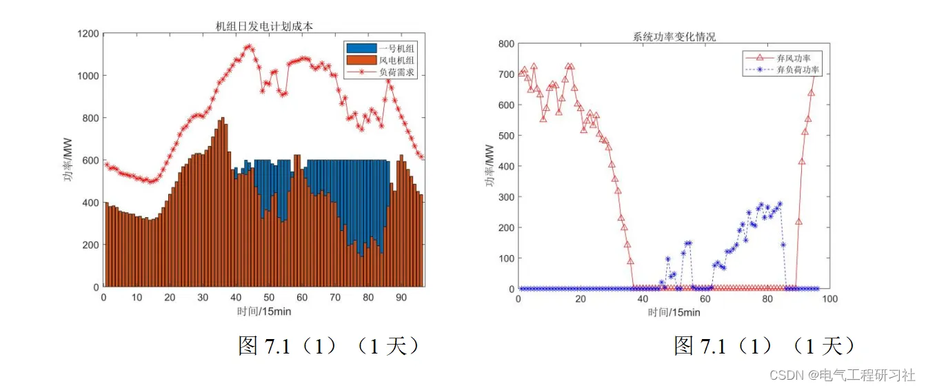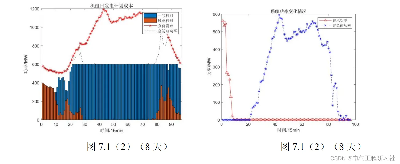 我们拿第一天和风能最少的第8天为例子,根据最小发电成本为目标函数,绘制机组日发电计划曲线如下图,
