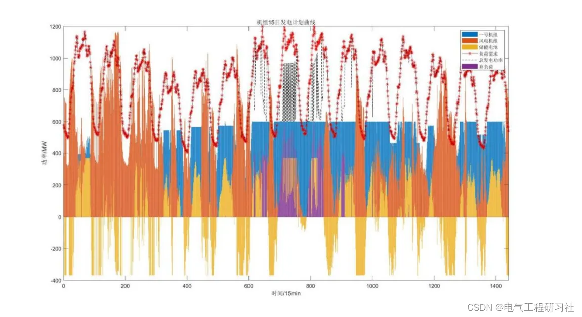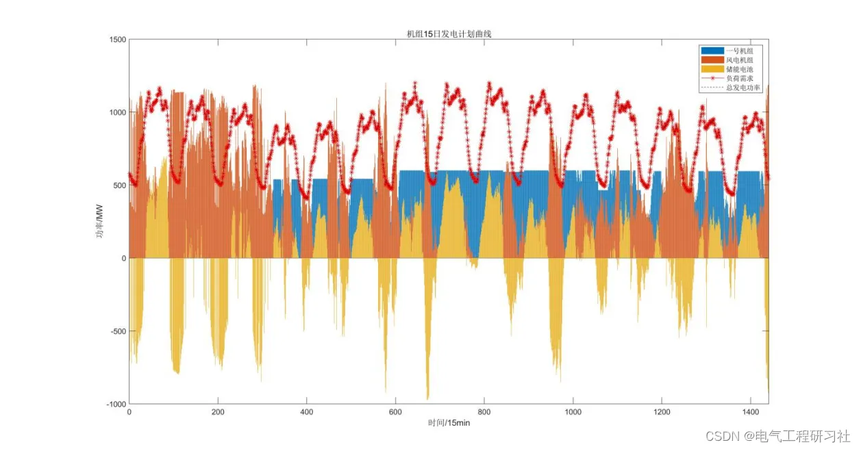 一般来说,储能系统一天调度周期结束时的剩余荷电状态经常被约束条件设置在40-60%之间,但通过观察本题所提供的十五天负荷及风电曲线可知(这里可以加一张15天内的负荷和风电图),风电在前六日的发出功率较为充沛,而在第七日和第八日左右出现枯竭的情况,此时火电机组即使满功率运行也无法满足实际负荷的需求。综上考虑,本文将储能系统一天调度周期结束时的剩余荷电状态设置为20%-90%,这使储能系统在十五天的调度周期中拥有更加灵活且经济的运行方式,如此大的剩余荷电状态范围设置大允许储能系统在风电充沛的时间段内存储足够的电量,以应对风电匮乏的时间段,最大程度上保障了供电的可靠性与经济性。