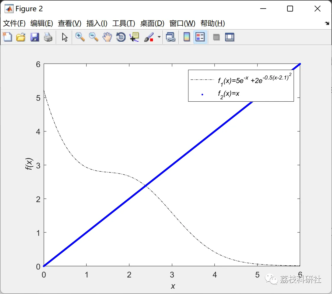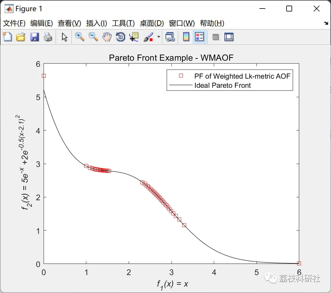 % Plot the Pareto Front figure(1); plot(PF(:,1), PF(:,2), 'rs'); hold on xlabel('\it f_{1}(x) = x'); ylabel('\it f_{2}(x) = 5e^{-x} +2e^{-0.5(x-2.1)^{2}}'); title('Pareto Front Example - Tschebysheff');