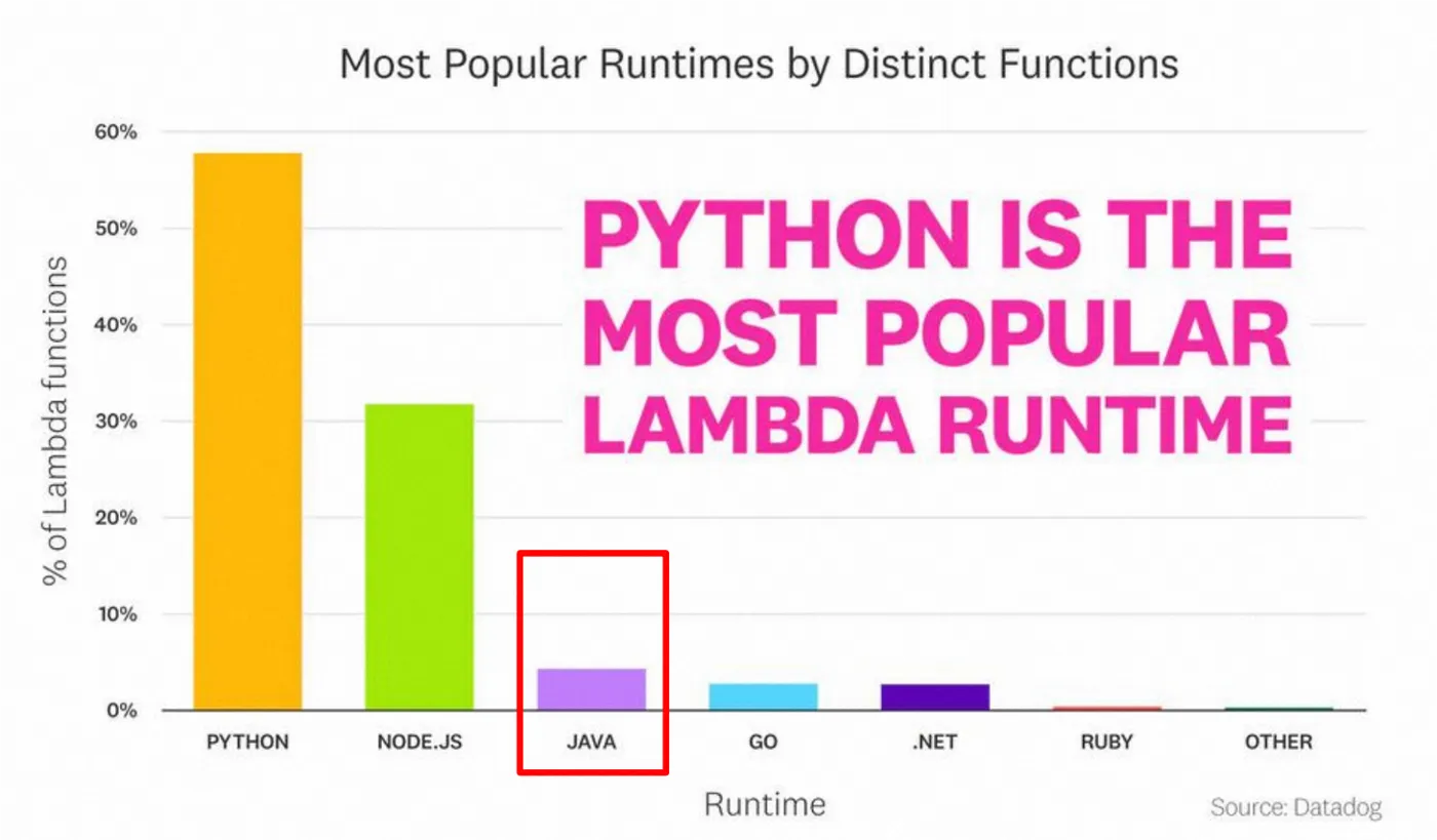 但在来到云计算时代,Java 应用的部署和运行开始面临非常多的问题。我们以Serverless为例,Serverless是云上的一种越来越主流的部署模式,它让开发者更专注业务逻辑、通过快速弹性等帮助解决资源问题,根据最新的一些数据,Java在所有云计算厂商的 Serverless 运行时中所占比例并不高,远远不能和它在传统应用开发中所占的比例相匹配。