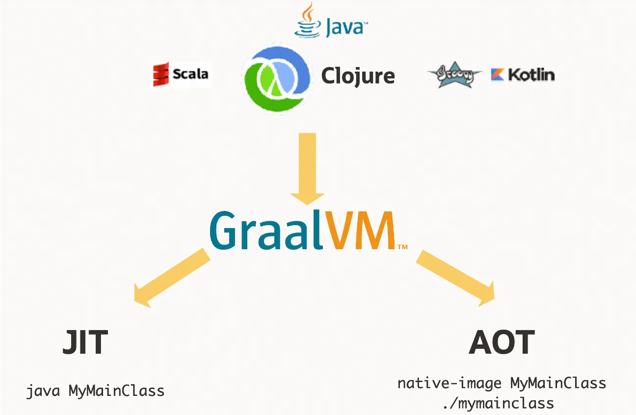 如上图所示,GraalVM 编译器提供了 JIT 和 AOT 两种模式。