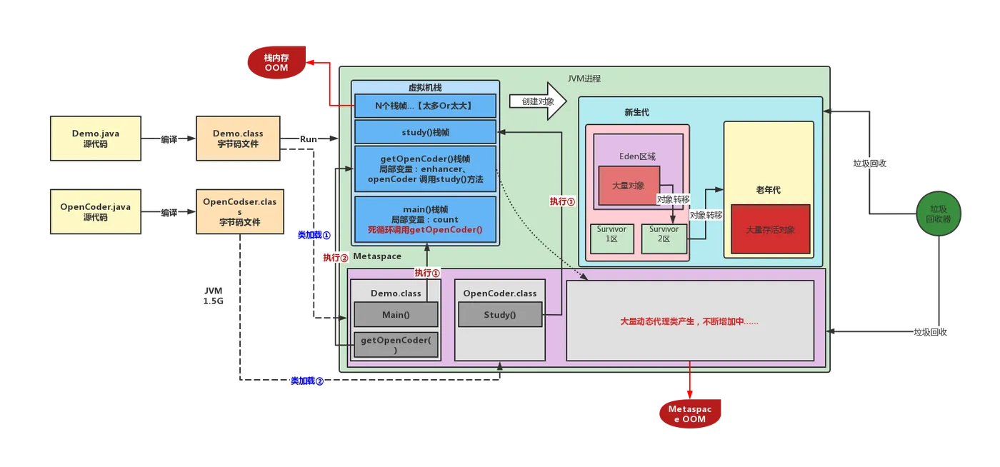 之前通过三篇文章的分析,介绍了 直接内存、Metaspace和栈内存三块区域的内存溢出,同时给出了一些常见的引发内存溢出的场景以及对应解决方案,一般只要vm参数配置合理,代码上不出现大问题,一般不太容易引发对应的OOM。再次通过下图进行回顾: