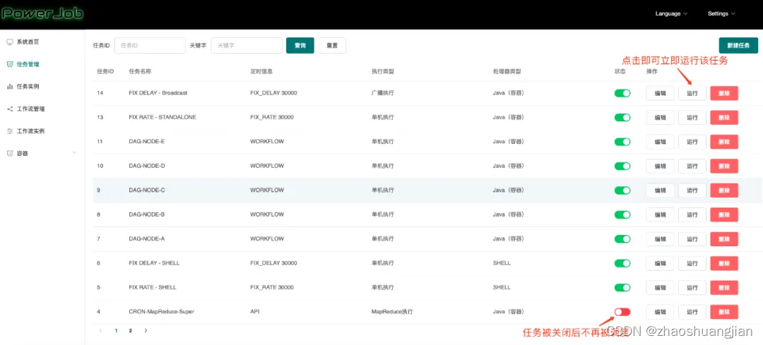 完成任务创建后,即可在控制台看到刚才创建的任务,如果觉得等待调度太过于漫长,可以直接点击运行按钮,立即运行本任务。