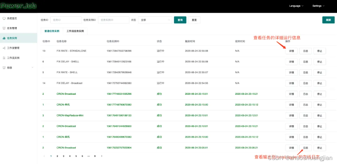 前往任务示例边栏,查看任务的运行状态和在线日志